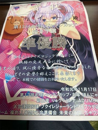 昨日は国分寺の大会に出てから声優イベントを満喫し、終電で名古屋まで戻ってカプセルホテルへ。当日の朝にしらさぎの始発に乗って福井まで行ってきました。 今年のレジャ予選はことごとく土日のどちらかが何かしらのイベントと被っており、唯一行けそうだっ…